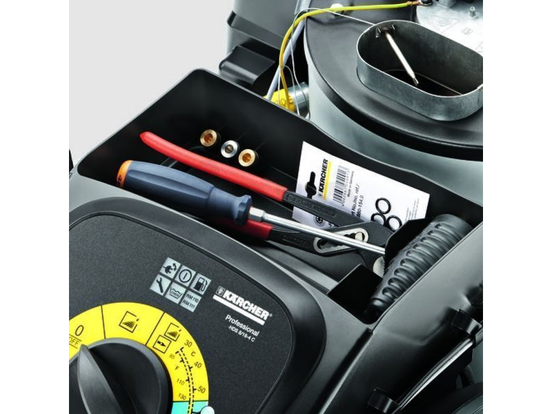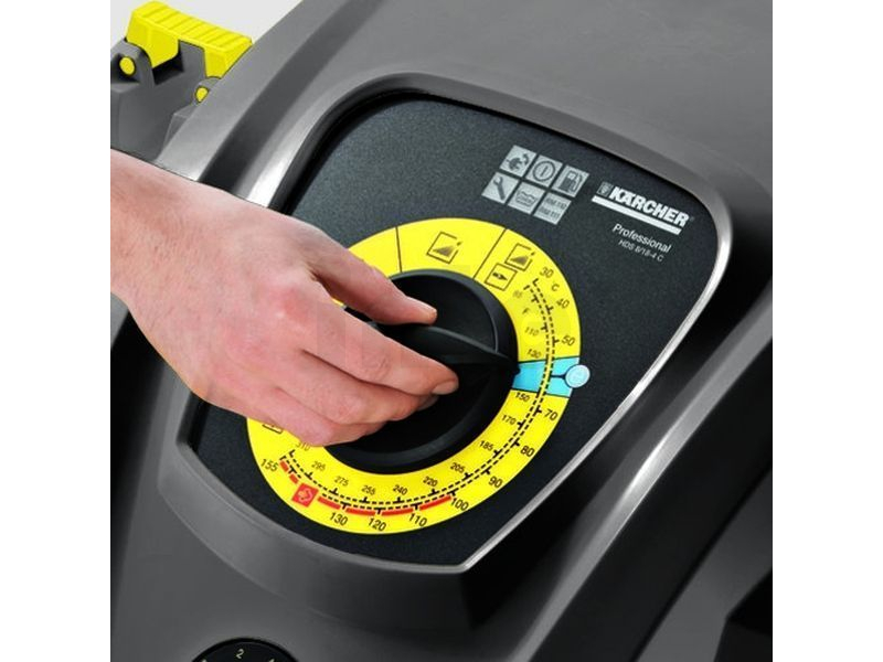 Stroj KÄRCHER HDS 8/18-4 CX je díky velkým kolům a vodicím kolečkům velice mobilní a díky přehlednému centrálnímu obslužnému poli s jednotlačítkovým spínačem a kontrolkami je velmi snadno ovladatelný.