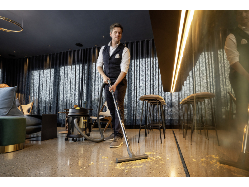 Nárazová ochrana nacházející se kolem celého stroje chrání nejen samotný vysavač, ale rovněž stěny, stroje a předměty zařízení v daném prostoru před poškozením. Nádoba z ušlechtilé oceli odolná proti korozi, kyselinám a louhu zajišťuje dlouhou životnost profesionálního vysavače.