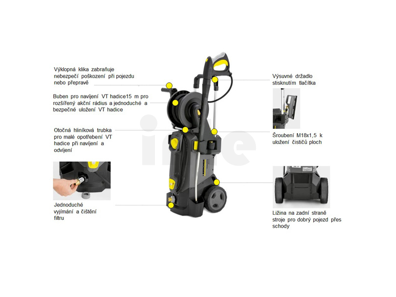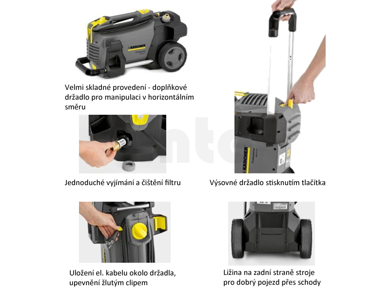 K známému Kärcher vybavení patří plné opláštění z nárazuvzdorného plastu, které chrání vysokotlaké čerpadlo a motor před poškozením a nečistotami. Velmi dobře a prakticky je vyřešena zadní strana stroje, kde je možné zavěsit elektro kabel (s fixací zástrčky) a uložit trysky do přihrádky.