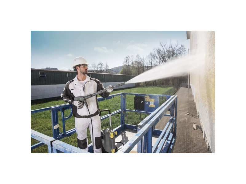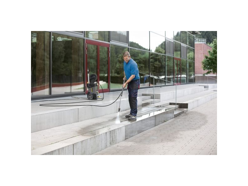 K známému KÄRCHER vybavení patří plné opláštění z nárazuvzdorného plastu, které chrání vysokotlaké čerpadlo a motor před poškozením a nečistotami. Velmi dobře a prakticky je vyřešena zadní strana stroje, kde je možné zavěsit elektro kabel (s fixací zástrčky) a uložit trysky do přihrádky.
