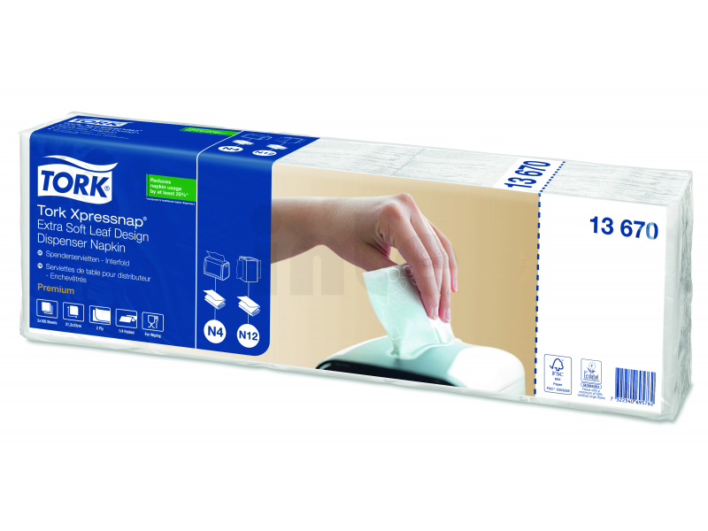 Systém vám pomůže snížit spotřebu ubrousků o 25 % v porovnání s tradičními zásobníky na ubrousky. Dvouvrstvé, extra jemné bílé ubrousky do zásobníku TORK Xpressnap® se vzorem listů jsou ideální do podniků, které dbají na komfort a chtějí na zákazníky udělat dojem vysoké kvality tím, že jim nabídnou velký, extra pevný ubrousek s propracovaným designem.