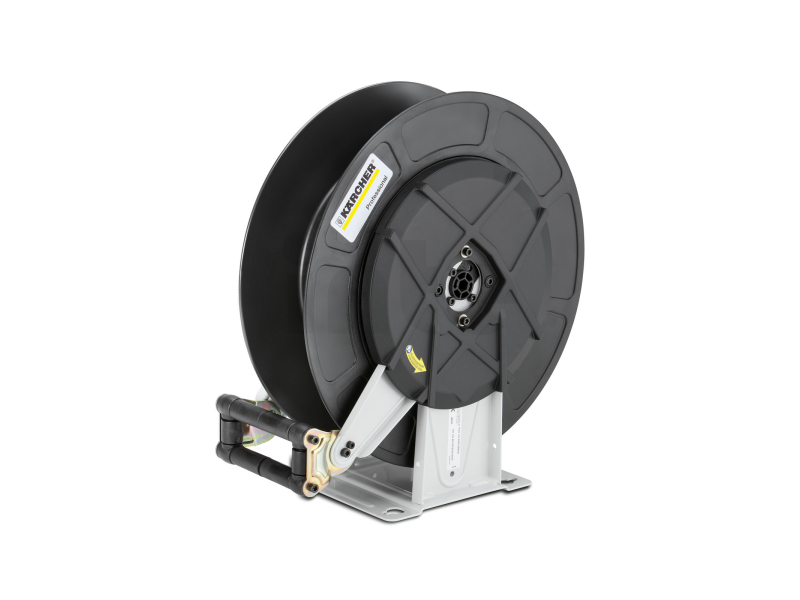 Automatický hadicový buben pro 20 m dlouhou vysokotlakou hadici. Konzole je vyrobena z oceli s práškovou vrstvou, buben vyroben z plastu.