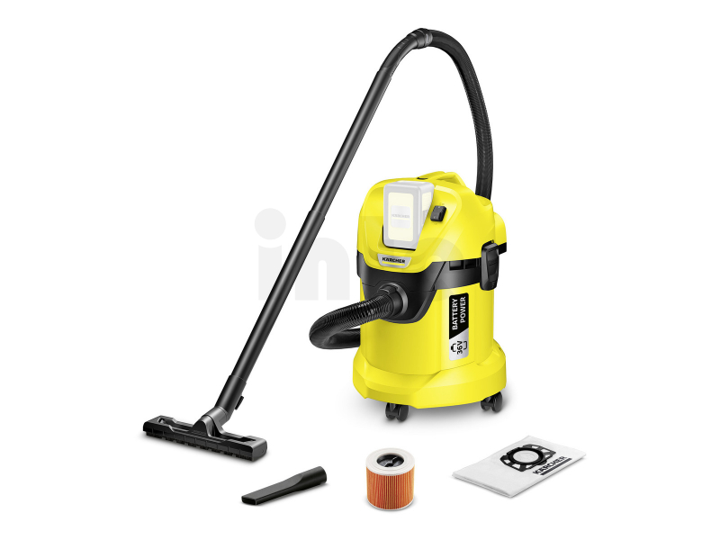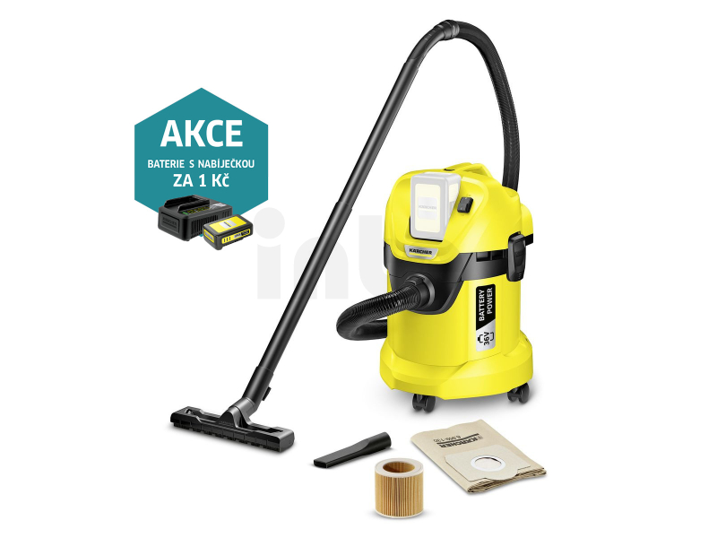 Vysavač na mokré a suché vysávání Kärcher WD 3 Battery je stejně funkční jako víceúčelový vysavač s kabelem, ale nemusí být zapojen do sítě. V závislosti na baterii je výdrž baterie 15 až 30 minut (baterie není součástí dodávky). Flexibilní AKU víceúčelový vysavač má také robustní a nárazuvzdornou plastovou nádobu o kapacitě 17 litrů a kazetový filtr pro snadné vysávání suchých a mokrých nečistot bez nutnosti výměny filtru. Sací hadice optimalizovaná pro průtok a podlahová tryska inteligentních klipů se smíšenou vložkou pomáhají zajistit optimální zachytávání nečistot a zaručují dokonalou čistotu. Dalším praktickým detailem vysavače je odnímatelná rukojeť, která umožňuje připojit příslušenství přímo k sací hadici. Praktická parkovací poloha zajišťuje pohodlné parkování sací trubice a podlahové hubice při přestávce v práci. Kompaktní AKU vysavač WD 3 usnadňuje čištění díky dalším funkcím, jako je funkce dmychadla, zamykací systém Pull & Push, ergonomická rukojeť pro přenášení a řešení pro ukládání příslušenství. A díky kompatibilitě Kärcher baterie, lze baterii 36 V využit i na další techniku o této platformě.