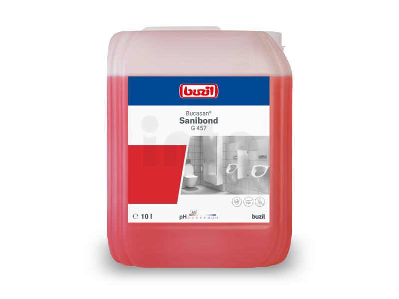 Buzil Bucasan Sanibond G457 je profesionální čisticí prostředek určený pro každodenní úklid sanitárních zařízení. Je určen pro použití ve všech typech mokrých místností, zejména pro toalety a koupelny. Používá se na kyselinovzdorné povrchy a materiály, jako jsou keramické dlaždice, umyvadla a toaletní mísy. Lze jej také použít k čištění chromovaných, nerezových a hliníkových povrchů, stejně jako na glazuru a tarakot. Tekutina na bázi kyseliny citronové dokonale odstraňuje houževnaté usazeniny vodního kamene, mýdlo a další nečistoty. Díky své husté a lepivé konzistenci dokonale přilne ke svislým povrchům. Poskytuje efekt korálkování a zanechává povrch lesklý, bez šmouh a nutnosti zaschnout. Má svěží jahodovou vůni, která zdůrazňuje čistotu a hygienu místnosti. Lze použít s generátorem pěny.