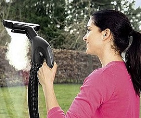 Před použitím parního čištění je dobré okna běžně opláchnout. Okna poté můžete pomocí ruční hubice a utěrky z mikrovlákna důkladně vyčistit. Vodu, kterou Vám pára na oknech zanechá, můžete dobře setřít okenní stěrkou. Zbylou vodu na rámech jednoduše setřete utěrkou.