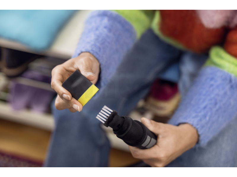 - Vyměnitelný kartáčový nástavec pro důkladné čištění podrážek a svršků bot. Aplikace bez kapání, protože voda je během čištění automaticky vysávána. Nízká zbytková vlhkost pro rychlé schnutí textilních povrchů.
