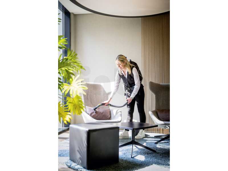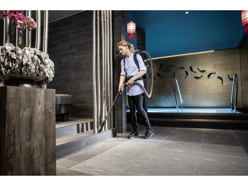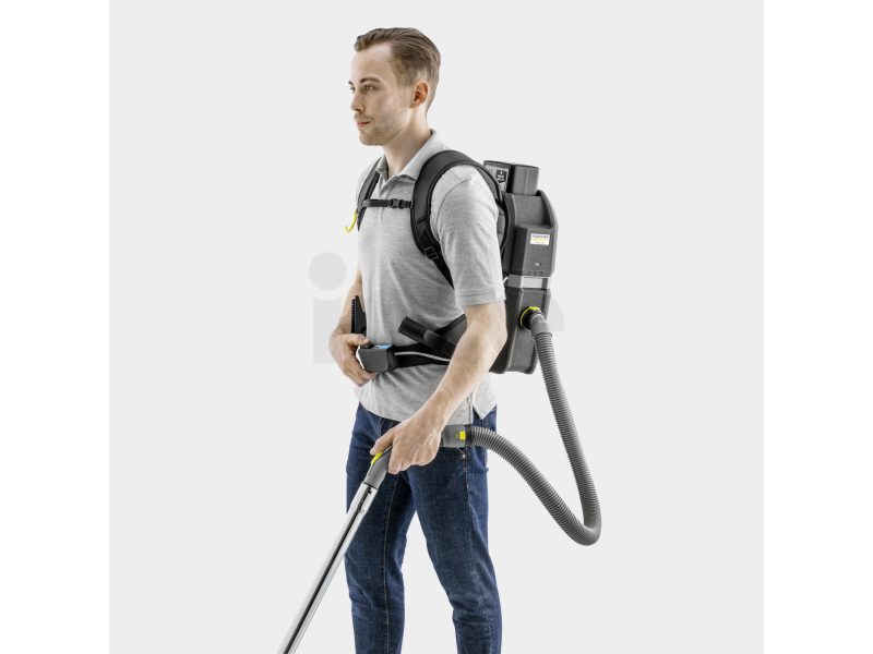 Vysavač má objem nádoby na nečistoty 5 l je dodáván bez baterie, která pohání bezuhlíkový motor o výkonu 500 W. Práci velmi usnadňuje ergonomický nosný rám, díky kterému uživatel vůbec nevnímá ani minimální hmotnost tohoto zádového vysavače. Ovládání vysavače je řešeno pomocí ovládacího panelu, který je umístěn na bederním popruhu a je tedy velmi dobře dostupný. Díky promyšlené konstrukci mohou zařízení pohodlně využívat praváci i leváci. Sací hadici lze připojit odlišně pro praváky a leváky.