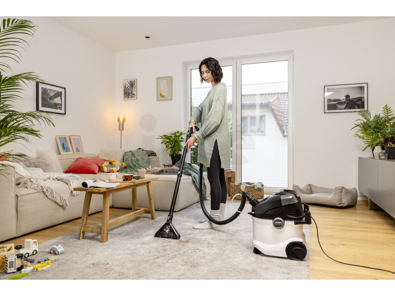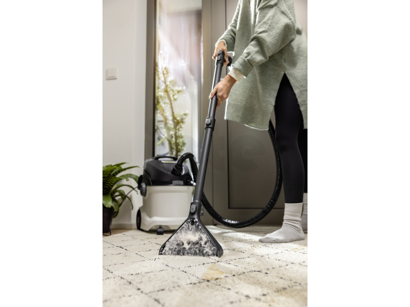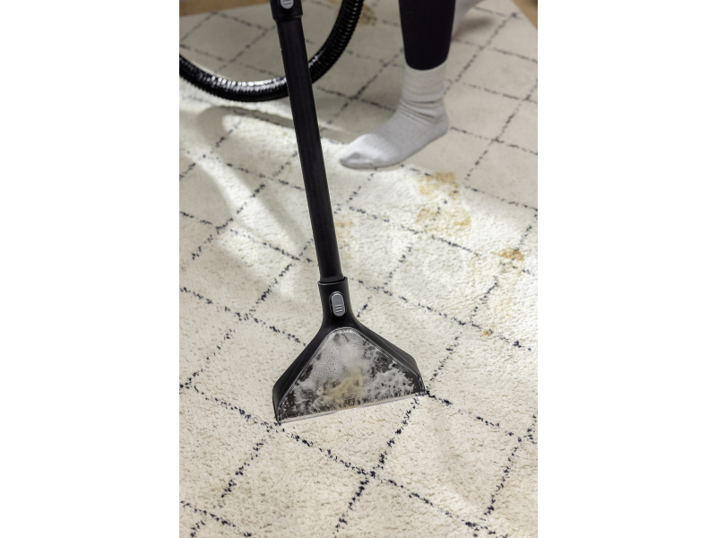 • Integrovaná stříkací hadice pro větší pohodlí při čištění. Dlouhá, vysoce flexibilní sací hadice pro větší pohodlí při čištění. Rukojeť s funkcí zámku pro nepřetržitý postřik při čištění velkých textilních ploch.