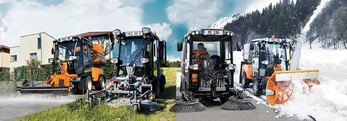 Minimální rozměry, maximální výkon: Náš víceúčelový zametací stroj MC 130 Plus je ekonomickým řešením ve třídě 3,5 t s dvoumístnou kabinou a pohonem všech kol.
