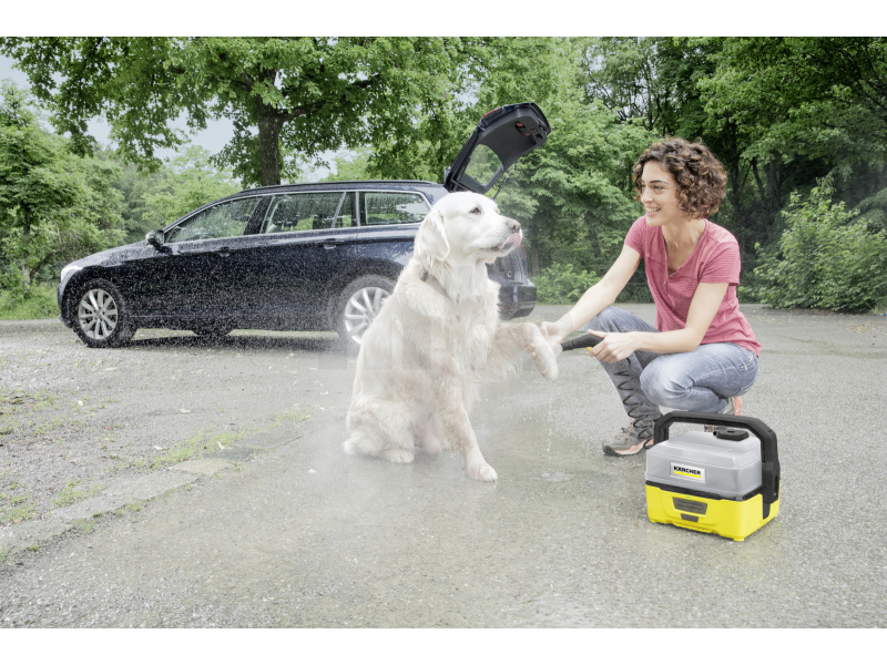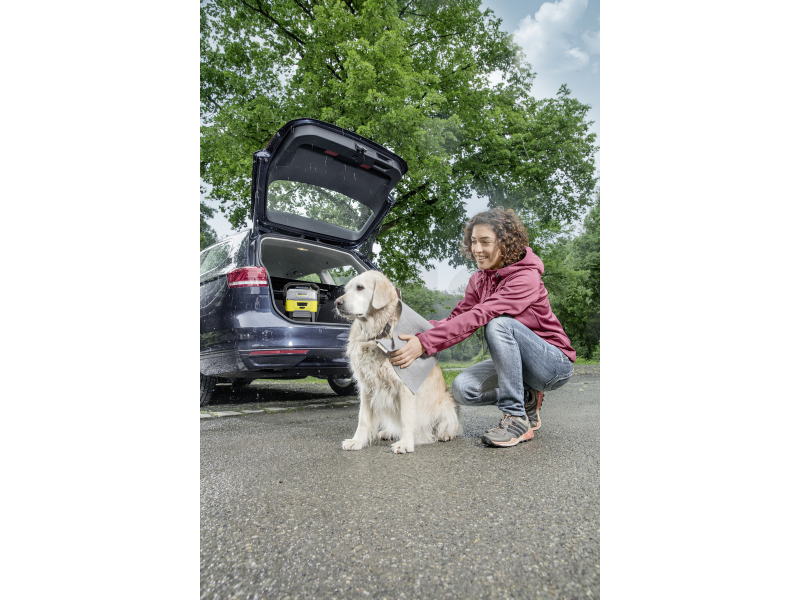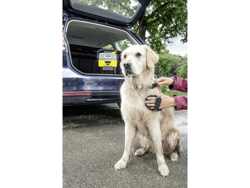 Mobilní outdoorový čistič firmy Kärcher s lithium-iontovou baterií a odnímatelnou nádrží na vodu je dokonalý pro rychlé očištění domácích zvířat od nečistot bez velké námahy, např. než pes opět skočí do auta. Díky nízkotlaku je vodní paprsek mimořádně šetrný a neškodný pro používání na zvířata a snadno opláchne nečistoty ze srsti. Včetně pet boxu s optimálně zvoleným příslušenstvím: vířivá tryska s měkkým sprchovacím paprskem pro citlivá zvířata, kartáč na čištění srsti pro odstraňování silně ulpívajících nečistot a speciální utěrka z mikrovláken (savá a pohlcuje pachy) pro osušení zvířete. Box na příslušenství lze snadno upevnit na zařízení.