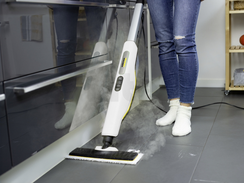Při důkladném čištění odstraní 99,99 procent bakterií běžných v domácnostech a to zcela bez použití chemie. Parní mop KÄRCHER lze během velmi krátké doby (30s) nahřát a také ho díky kdykoli naplnitelné a vyjímatelné nádrži na čistou vodu snadno obsluhovat bez nutnosti přerušit práci. LED ukazatel na zařízení zobrazuje prostřednictvím různých barevných kódů (červená /zelená) provozní stav.