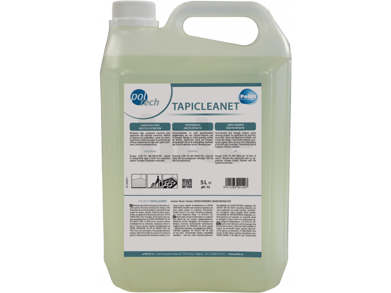 Extra voňavý koncentrovaný profesionální čistící prostředek pro čištění koberců extraktní metodou. Hloubkově čistí, odmašťuje a oživuje barvy. PolTech Tapicleanet obsahuje ochranný konzervační prostředek, který zabraňuje redistribuci nečistot po ošetření. Aktivně přispívá k eliminaci roztočů z koberců. Extra voňavá květinová vůně.