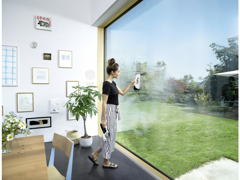 Pomocník určený k mytí oken výkladů a prosklených ploch. Zařízení sestává ze dvou částí. Hubice s nádržkou na vodu s čistícím médiem, rozprašovačem a stírací plochou s mopem. Touto hubicí se na sklo nanese voda s čistícím přípravkem a mopem se okno umyje. Druhou část tvoří hubice s nádobkou na znečištěnou vodu, stírací lištou a sacím motorem napájeným akumulátorem. Touto hubicí se znečištěná vody stáhne a vysaje do zásobníku.