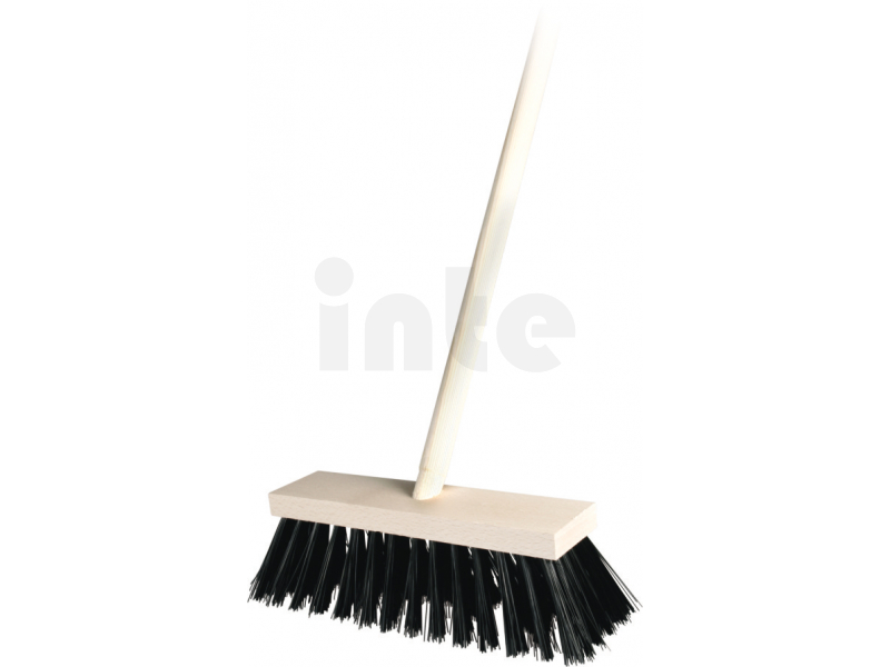 Tělo 30 x 7 cm z nelakovaného dřeva osazené neštěpenými syntetickými vlákny (PET) - VD (viditelná délka vláken) je 90 mm, hůl/násada 140 cm.