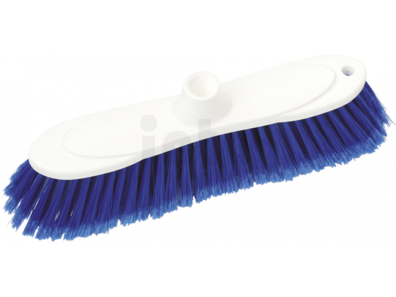 Smeták na hůl s tělem z plastu osazený štěpenými syntetickými vlákny a závitem.
