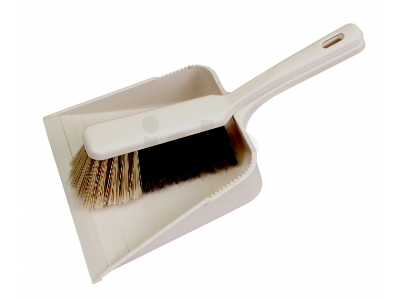Plastová lopatka a smetáček, který je osazena štěpeným syntetickým vláknem PET.