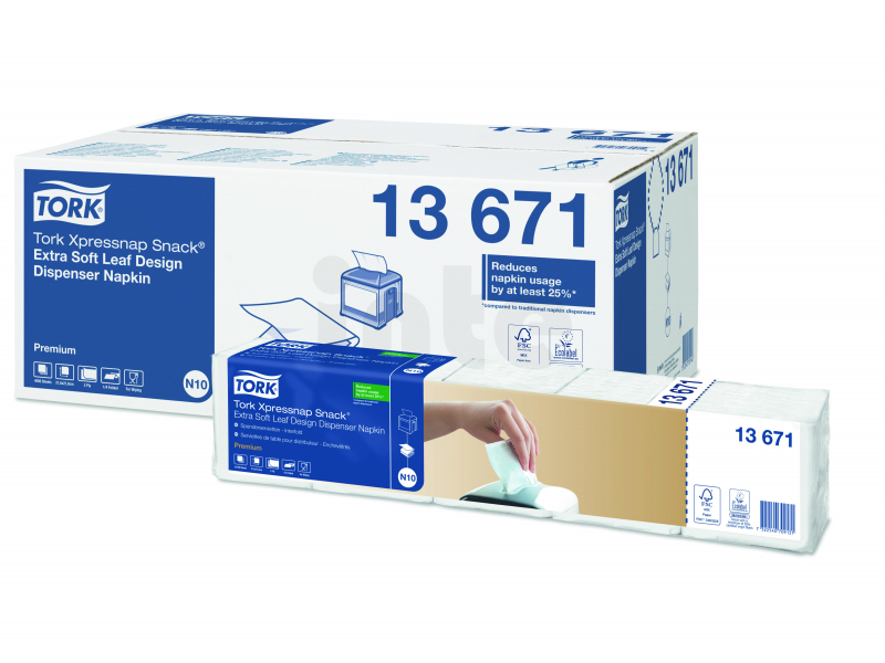 Systém dávkování vám pomůže snížit spotřebu ubrousků o 25 % v porovnání s tradičními ubrousky do zásobníku. Dvouvrstvé, extra jemné ubrousky do zásobníku se vzorem listů TORK Xpressnap Snack® jsou ideální do podniků, které dbají na komfort a chtějí na zákazníky udělat dojem vysoké kvality tím, že jim nabídnou pevný svačinový ubrousek s propracovaným designem.