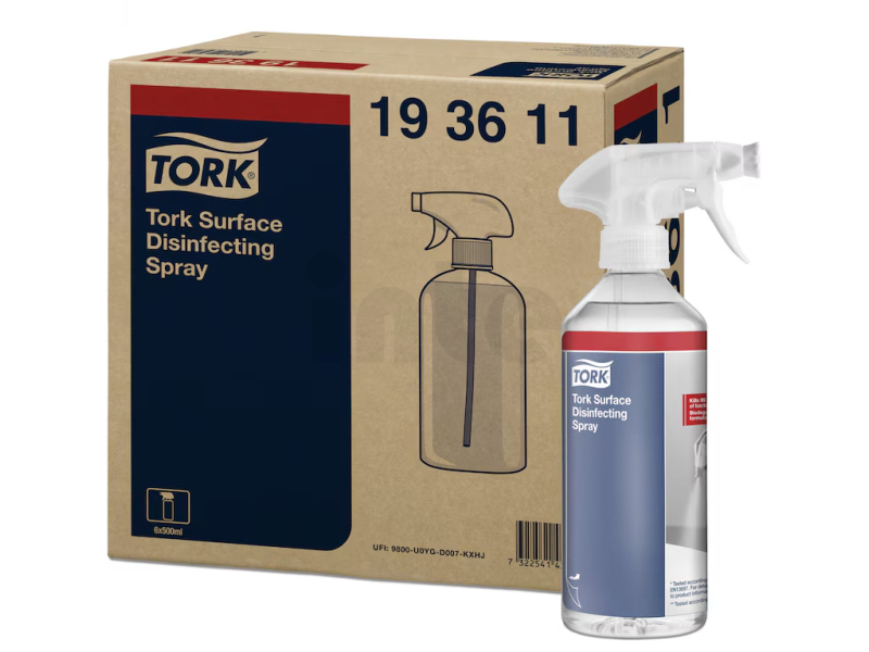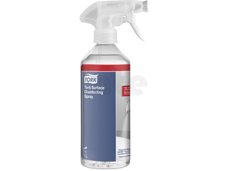 Tork sprej na dezinfekci povrchů je dezinfekční prostředek připravený k použití, který účinkuje proti širokému spektru bakterií, virů a kvasinek včetně koronaviru. Jedná se o přípravek s biologicky odbouratelným složením, který obsahuje účinnou látku 100% rostlinného původu (kyselinu mléčnou). Sprej na dezinfekci povrchů je bezpečný při styku s potravinami a je k dispozici v 500ml lahvičce s rozprašovací tryskou s dvojí funkcí (sprej a pěna).