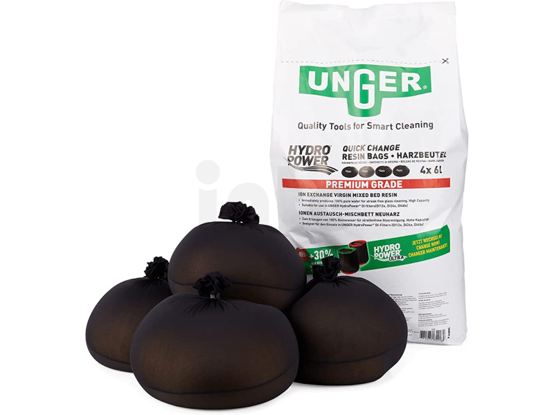 Nový vak s pryskyřicí QuickChange ™ usnadňuje výměnu pryskyřice a zajišťuje nejvyšší možnou míru komfortu, bez ohledu na to, kdy a kde je to potřeba. Lze jej vyměnit stejně snadno jako filtr v kávovaru. Každý sáček obsahuje předem stanovené množství čerstvé iontoměničové pryskyřice Unger Premium. Textilní materiál propouštějící vodu podporuje tok vody. Pro maximální pohodlí stačí vyjmout a vyměnit použitý UNGER QuickChange ™ sáček s pryskyřicí.