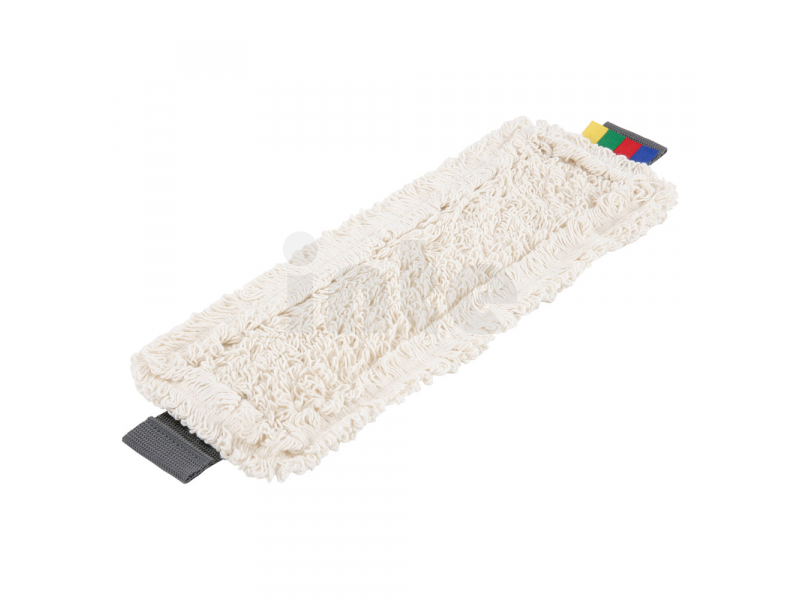Barevné kódování je zajištěno všitými barevnými štítky (nevhodné štítky se odstřihnou). Upevnění mopu do držáku pásky je nejpohodlnějším a bezpečným systémem, usnadňuje a urychluje manipulaci.