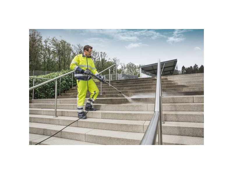 Ke známým znakům vybavení Kärcher patří plné opláštění z nárazuvzdorného plastu, který chrání vysokotlaké čerpadlo a motor před poškozením a znečištěním. Velmi dobře a prakticky je uspořádáno uložení kabelu (s fixací zástrčky) a trysek na zadní straně stroje.