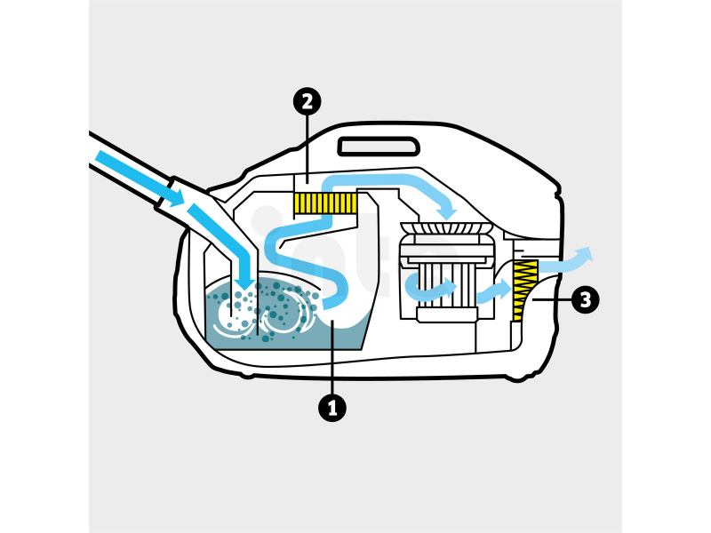 Díky systému vodního filtru se nevyskytují při vysávání žádné nepříjemné pachy, a oblaka prachu při výměně filtru jsou minulostí. Znečištěný vzduch je veden vodním filtrem, v jehož vodním víru jsou bezpečně vázány téměř všechny částečky špíny. Poté proudí vzduch vymyvatelným mezifiltrem s dlouhou životností, který zachytí zbylé a zároveň malé částečky prachu. Za ním následuje HEPA filtr, vyrobený speciálně pro moderní medicínu, který zachytí částečky o velikosti až do 0,3 µm. Tím vytvoří ochranný deštník proti roztočům, sporám a plísním. Odpadní vzduch z vysavače KÄRCHER DS 6 je na 99,99 % vyčištěn a tím výrazně čistější než okolní vzduch, což je velká výhoda pro osoby trpící alergiemi. "Filtr z vodovodního kohoutku" je efektivní a cenově výhodnější než každý papírový filtr. Po vysávání se voda jednoduše vyprázdní.
