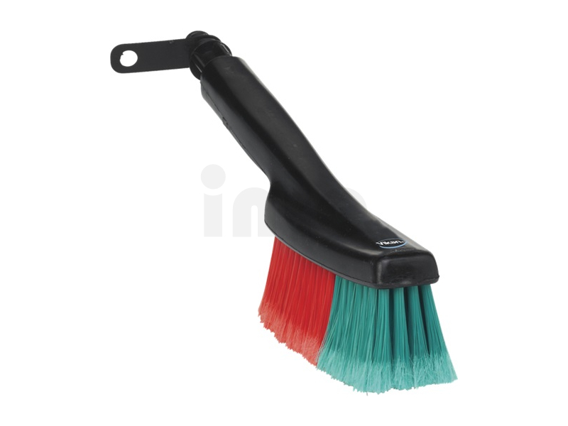 Vikan měkké štětiny na koncích roztřepené pro lepší mycí účinek.Průtokový kartáč s napojením na vodu pro čištění malých ploch.