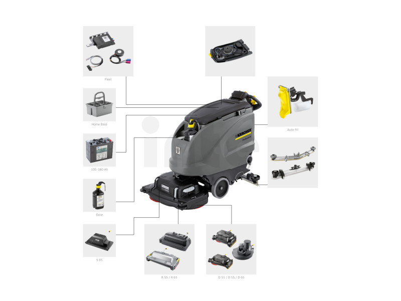 Ručně vedený podlahový mycí stroj KÄRCHER B 60 W Bat Pack R 65 s pojezdem lze jednoduše používat v různých oblastech nasazení. Stroj čistí pomocí 2 válcových kartáčů o šířce 650 mm (možnost výběru měkký, střední, tvrdý). Má možnost regulace přítlaku kartáče, což značně prodlužuje trvanlivost a zvyšuje pracovní výkon stroj. Včetně fuknce předmetání do zásobníku na nečistoty.