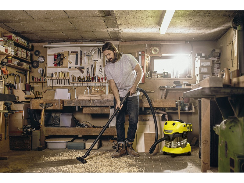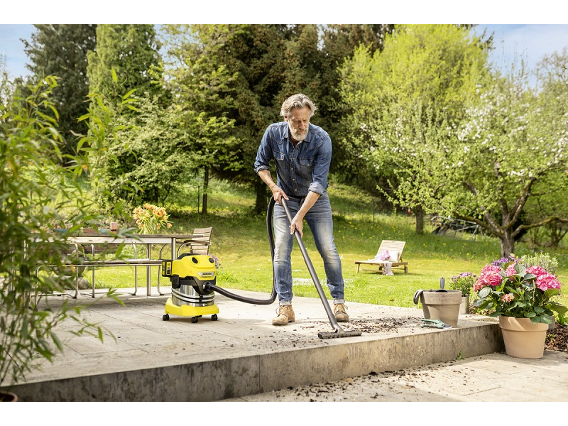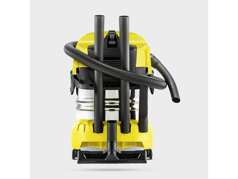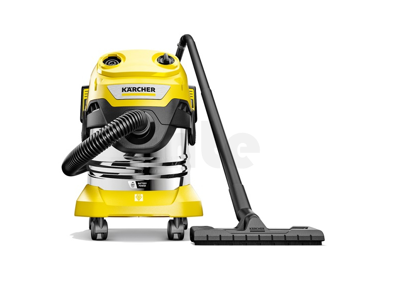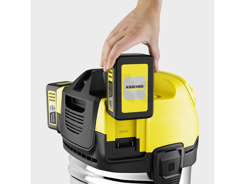 Bateriový vysavač KÄRCHER WD 4-18 S Dual Battery Set disponuje nárazu vzdornou nerezovou nádobou o objemu 20l s pojezdovými kolečky pro jednodušší manipulaci a také držákem na sací hlavě, který usnadňuje transport vysavače.