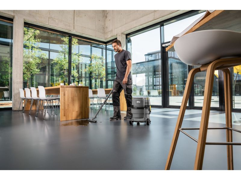 První AKU vysavač na mokré a suché vysávání pro profesionální využití od společnosti Kärcher je lehký, kompaktní, všestranný a zároveň výkonný. Díky silné baterii Kärcher Power+ zapůsobí tento průmyslový vysavač především na místech, kde chybí připojení k sítí. Je vhodný pro náročné mokré i suché nečistoty. Baterie je díky klapce chráněna před všemi nečistotami i tekutinami. Zajišťuje vysoký sací výkon a dlouhou dobu provozu. Tento multifunkční vysavač je vybaven prostorově úsporným plochým skládacím filtrem a elektronickým uzavíráním vody. Je proto vhodný pro vysávání kapalin, hrubých nečistot a jemného prachu. Díky svých kompaktním rozměrům a nízké hmotnosti je manipulace s ním velmi jednoduchá – zejména v těsných prostorech a silně frekventovaných oblastech. Praktická je plochá konstrukce hlavy stroje umožňující odkládací plochu.