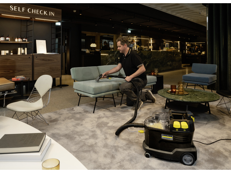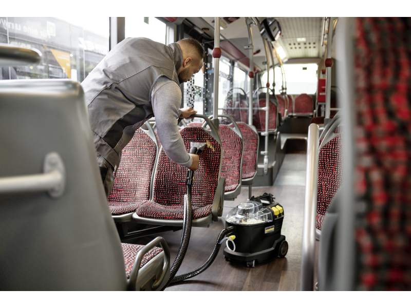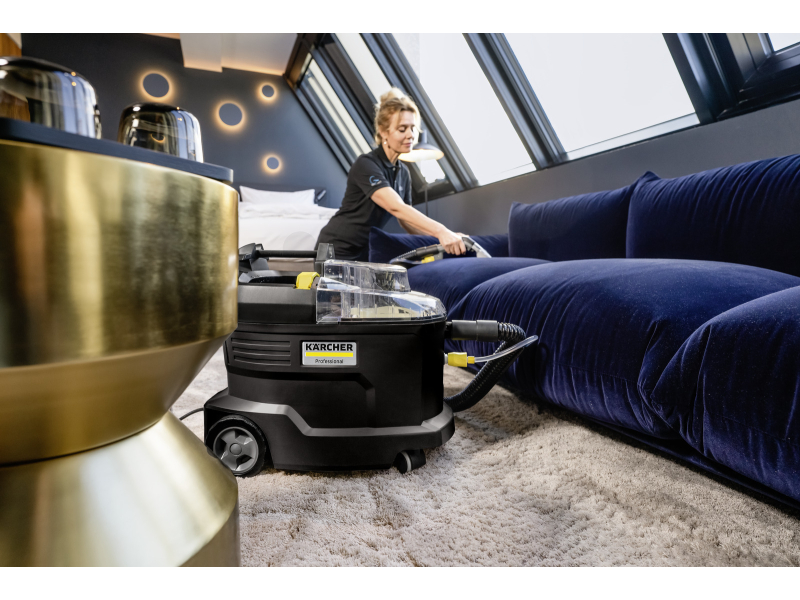 Díky účinnému výkonu zpětného sání jsou povrchy rychle suché a brzy připravené k použití. To činí zařízení ideálním pro profesionální úklid v hotelovém a gastronomickém průmyslu nebo pro čištění interiérů vozidel. Krátká hubice na čalounění umožňuje snadné čištění i ve stísněných prostorách.