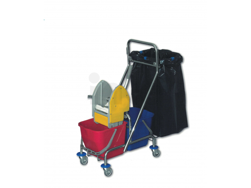 Úklidový vozík se dvěma kbelíky 17 l, včetně ždímače a držáku pytle na odpadky.