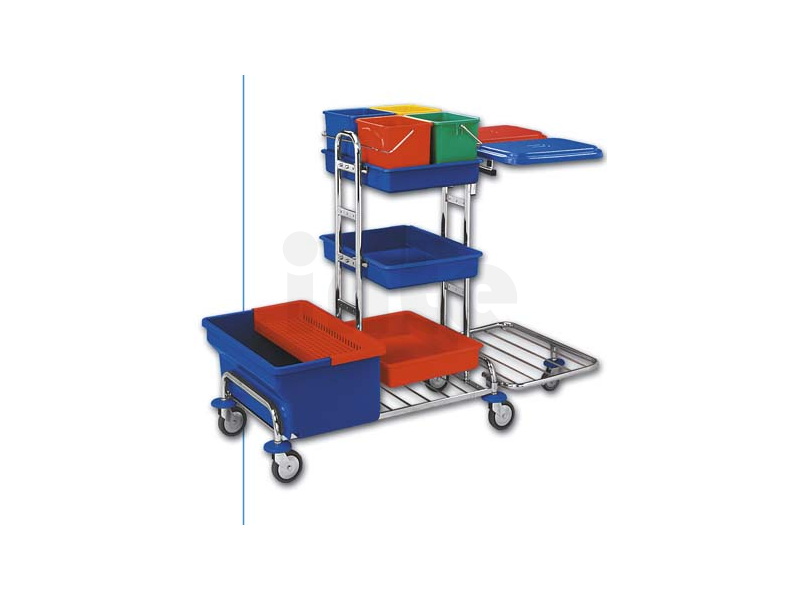Úklidový vozík s dezinfekční vanou, čtyřmi kbelíky 6 l, třemi vaničkami a dvěma držáky na odpad.