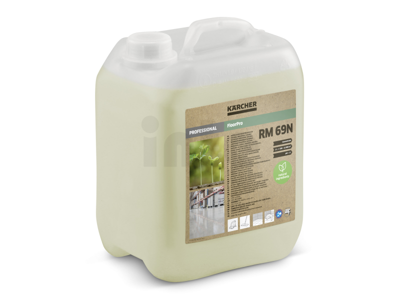 KÄRCHER FloorPro RM 69N je přírodní průmyslový čistič vyrobený z více než 99 % přírodních složek, včetně povrchově aktivních látek z kokosu a kukuřice, pocházejících z odpadních produktů potravinářského průmyslu. Tento čisticí prostředek je netoxický, neobsahuje fosfáty, mikroplasty, vonné látky, barviva ani silikonové oleje. Díky jeho ekologickému složení není klasifikován jako nebezpečné zboží, což zajišťuje snadnou přepravu a skladování.