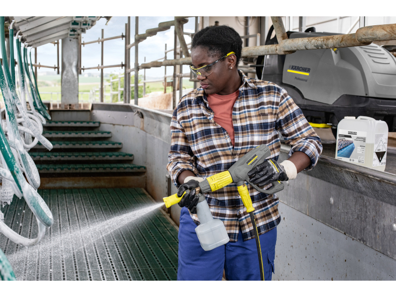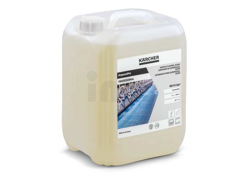 Kyselého čističe povrchů KÄRCHER PressurePro RM 93 Agri s hustou konzistencije určený na čištění dojíren a mlékáren na farmách. Viskózní čistič přilne k zařízení, rámům, spojům a štěrbinám. Anorganické usazeniny, jako je vodní kámen, rez, mléčný kámen a močový kámen, jsou odstraněny bez námahy, a snižuje se riziko uklouznutí zvířat na pochozích a stojícím místech. RM 93 Agri je bezpečný pro použití na nerezovou ocel, dlaždice a plasty. Pro snížení potenciálních patogenů střídejte s alkalickým pěnovým čističem PressurePro RM 91 Agri.