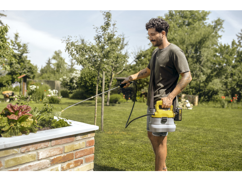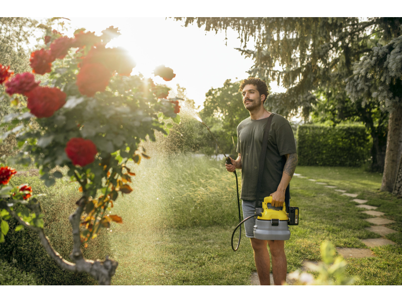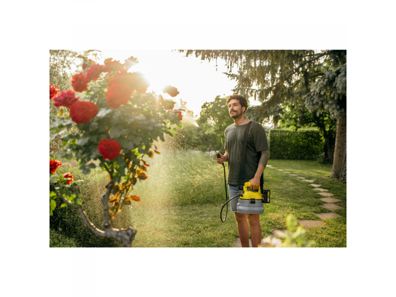 Nastavitelná tryska je plynule nastavitelná, od jemné postřikové mlhy, přes pečlivé zalévání jemných sazenic jemnou mlhou, až po selektivní vodní paprsek pro cílenou distribuci pesticidů nebo tekutých hnojiv. Hnojivo nebo pesticidy lze snadno dávkovat pomocí odměrky integrované do uzávěru nádrže. Díky průhledné nádobě na první pohled vidíte, kolik tekutiny zbývá ve 4litrové nádrži. Teleskopickou stříkací násadu lze prodloužit ze 45 cm na 75 cm pro větší dosah a uzamykatelná stříkací spoušť vám umožní pracovat bez únavy v nepřetržitém provozu. Po práci je stříkací tryska bezpečně uložena v držáku, aby se ušetřilo místo. Akumulátorový tlakový postřikovač KÄRCHER PSU 4-18 lze provozovat se všemi lithium iontovými akumulátory 18V bateriové platformy, které se používají i v jiné zahradní technice a nářadí Kärcher.