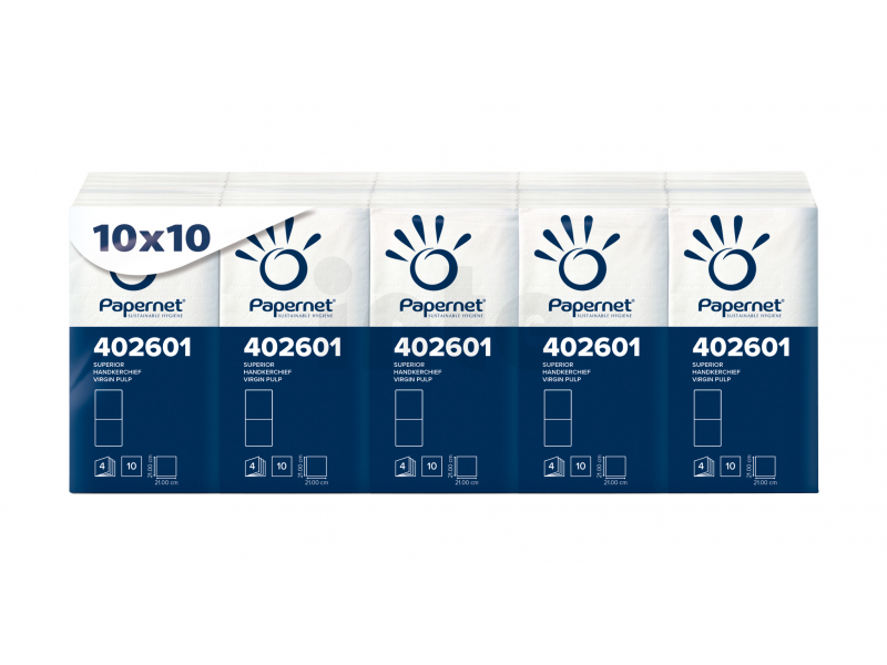 Papírové kapesníky SUPERIOR od výrobce Papernet, bělost 85 %, rozměr 1 ks kapesníku je 21 x 21 cm, 10 ks kapesníků v 1 obalu, 10 ks obalů v 1 balení.
