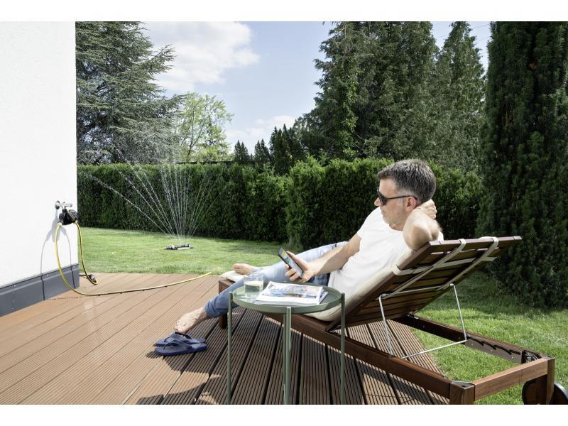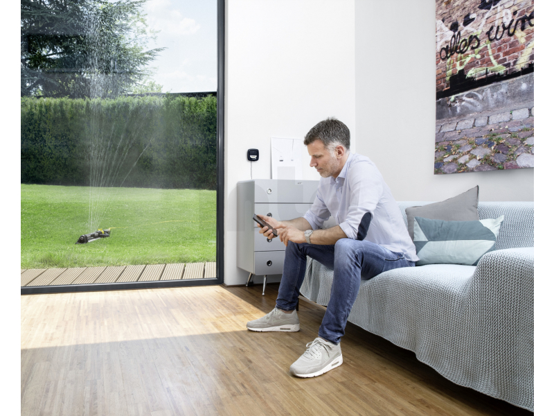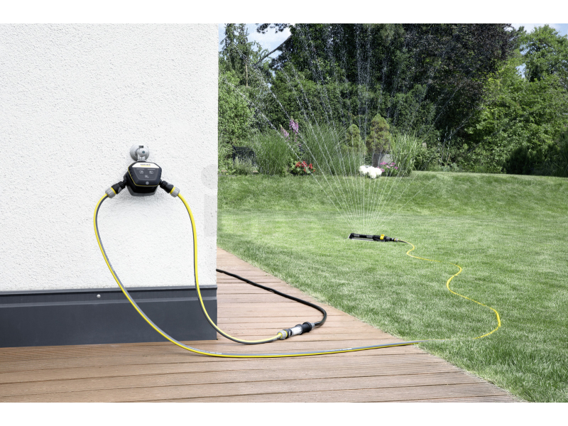 Systém pro chytré zavlažování zahrady obsahuje Water Controller Duo Smart, Gateway (rozhraní mezi Controller a sítí WLAN), přípojku na kohoutek a vstupní filtr. Water Controller Duo Smart je vybavený 2 nezávislými výstupy vody, které umožňují flexibilní nastavení zavlažování. Obsluhu zajišťuje Kärcher Home & Garden App – kdykoli a odkudkoli. Prostřednictvím aplikace lze nastavit na den a výstup vody neomezené časy zavlažování s maximální dobou zavlažování á 90 minut a zavlažování naplánovat na celý týden. Další praktické funkce aplikace: řízení zavlažování upravené podle aktuálního počasí, Amazon Alexa-řízení pro nekomplikovanou obsluhu a přehled týdenních statistik zavlažování. Watering System Duo Smart Kit lze řídit nejen prostřednictvím aplikace, samozřejmostí je i manuální zavlažování stisknutím tlačítka v kteroukoli dobu. Na Gateway je možné napojit až 30 zařízení. Sada neobsahuje 4 AAA baterie.