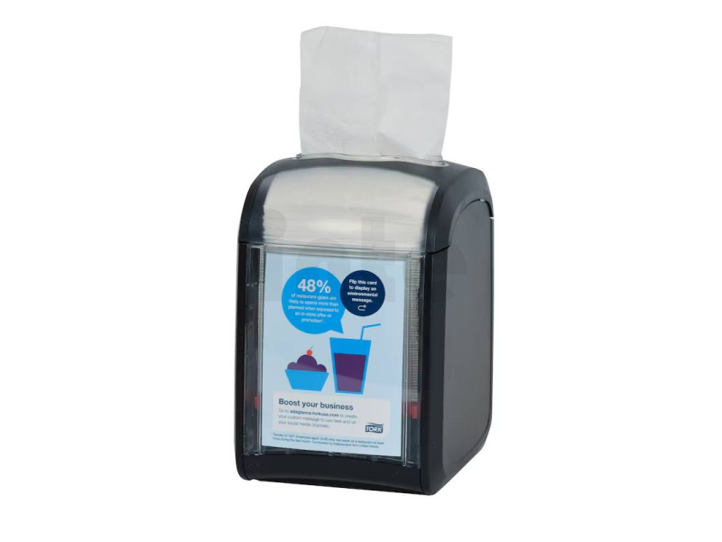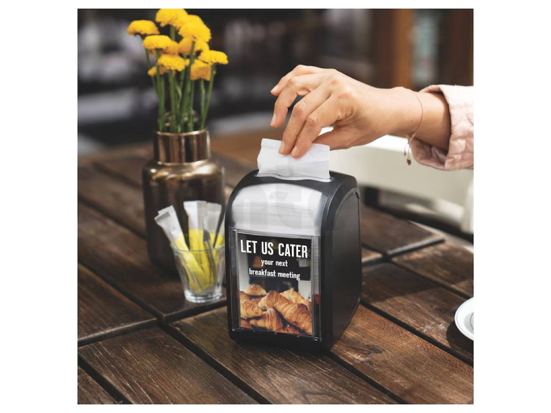 Ubrousky plné velikosti jsou složené tak, aby se pohodlně vešly do malého zásobníku, přičemž ukazatel množství vás včas upozorní na nutnost doplnění. Díky odolné konstrukci je zásobník snadno čistitelný a chrání ubrousky před nečistotami a politím, což napomáhá udržovat vysoký standard hygieny v provozu a zároveň snižuje čas i náklady na údržbu.