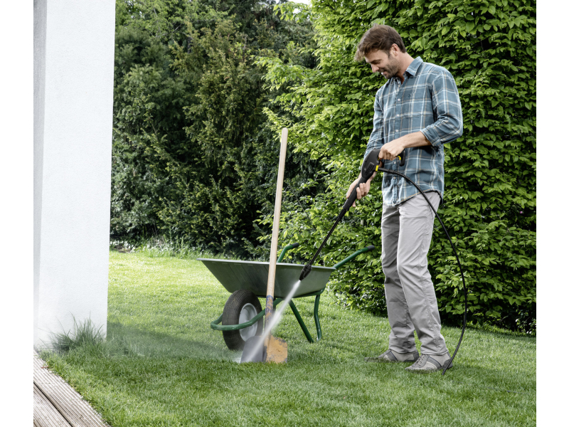 Tlaková myčka K 2 Universal si poradí s nečistotami kolem celého domu. Snadno s ní vyčistíte špínu ze zahradního nábytku, nářadí nebo jízdního kola. Díky nízké hmotnosti a pohodlnému držáku se navíc lehce přenáší. Kompaktní tělo přístroje ukrývá výkonný motor s příkonem 1400 W, který vytvoří vodní proud o tlaku až 110 barů. Třímetrová vysokotlaká hadice usnadní úklid kolem domu i čištění hůře přístupných míst. Navíc ji od přístroje snadno odpojíte. Přesná rotační tryska účinně nasměruje vodu tam, kde je zrovna třeba, a zkrotí i odolnější nečistoty. A když se vše leskne čistotou, hadici, tlakovou pistoli i napájecí kabel snadno zasunete do přístroje a jednoduše uskladníte i na malém prostoru.