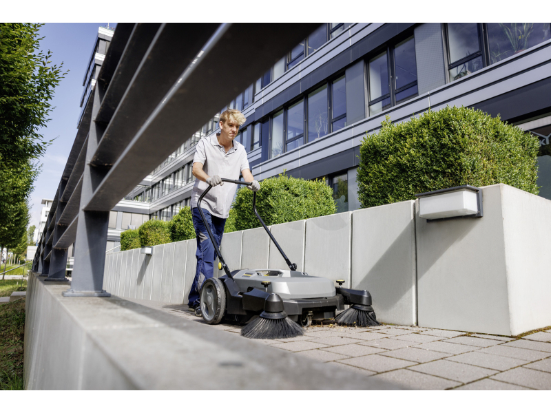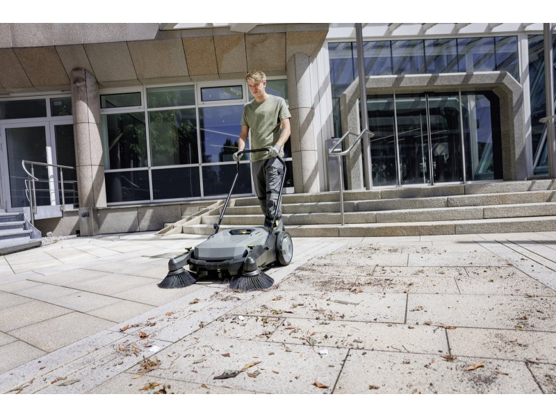 Zametací stroj KÄRCHER KM 70/20 C 2SB, který je ručně vedený, čistí pomocí dvou bočních kartáčů a zametacího válce. Díky kombinaci s ručním pohonem je úklid vnitřních i venkovních ploch jednoduchý a efektivní, přičemž plošný výkon tohoto stroje je devětkrát vyšší než u koštěte.